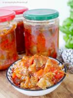 Grzyby w pomidorach – sałatka grzybowa do słoików 116Grzyby w pomidorach to przepyszna sałatka z grzybów leśnych, cebuli i pieczonej papryki w sosie pomidorowym. Świetnie sprawdzi się jako dodatek do wszelkiego rodzaju mięs, makaronu