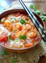Tajska zupa z pastą Tom Yum 243House od Asia wyjęłam: makaron ryżowy pastę Tom Yum suszone listki kaffiru mleczko kokosowe olej kokosowy Dodatkowo: 500 ml wody sól do smaku 3 łyżeczki sosu rybnego 3 plasterki świeżego imbiru ząbek czosnku pierś z kurczaka 6 sztuk krewetek 4 jaja natka kolendry czerwona papryczka chili cytryna a najlepiej limonka kilka pieczarek Czosnek i imbir utarłam w moździerzu. Rozgrzałam(...)Dodałam 2 łyżeczki pasty Tom Yum i zupa zaczęła nabierać smaku. Dodałam grzyby a przed końcem gotowania krewetki. Całości dopełniło mleczko kokosowe i posiekana papryczka chilli. W osobnym garnku ugotowałam makaron ryżowy według przepisu na opakowaniu. Jajka ugotowałam na półtwardo. Makaron wyłożyłam na półmiski, obok układałam mięso, krewetki, połówki jajka i posypałam świeżą natką kolendry. Podałam cytrynę i krążki papryczki
