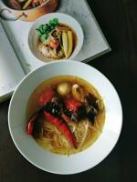Zupa tajska. 397pierś z kurczaka 2 nieduże marchewki 1 mała pietruszka 4 listki limonki kafir 10 grzybów mung 1,5 łyżki zielonego curry (pasta) 1,5 limonki 4 łyżki słodkiego sosu sojowego 2-3 łyżki sosu rybnego szczypiorek garść kolendry 2 ząbki czosnku świeży imbir (kawałek wielkości kciuka) algi (ja wykorzystałam takie do sushi, na jeden talerz - 1 arkusz) makaron soba(...)kokosowe. Stawiamy na ogniu. Dodajemy 1,5 łyżki zielonego curry i liście limonki. Obieramy i kroimy w paski mrchewki i pietruszkę, wrzucamy do garnka. Namaczamy grzyby przez 5 min następnie kroimy i dorzucamy do zupy. Oczyszczamy pierś z kurczaka, kroimy w kostkę, opruszamy solą i pieprzem, dorzucamy do zupy. Dodajemy sos sojowy i rybny, posiekany drobno czosnek, garść kolendry