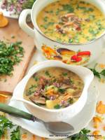JESIENNA ZUPA GRZYBOWA 239prawda dopiero niedawno, ale jak to mówią lepiej późno niż wcale. Tak więc chociaż skromnie, to na na kilka obiadów się załapaliśmy. Dzisiaj polecam Wam pyszną, domową zupę grzybową, na bazie świeżych grzybów leśnych i suszonych (na szczęście tych mam duży zapas od ubiegłego roku). Zupa jest bezglutenowa, może być również bez laktozy, ja do swojej dodałam jednak śmietankę(...)500g obranych ziemniaków - 300-400g świeżych (lub mrożonych) grzybów leśnych - mała garść grzybów suszonych - 400ml bulionu (dałam wywar z parzenia szynki ) - 1/2 łyżeczki suszonego tymianku - sól, świeżo mielony pieprz (do smaku) - 3 łyżki słodkiej kremówki (można pominąć) - natka pietruszki - szczypior do posypania zupy Dodatkowo: - 2-4 plastry boczku (nie trzeba) W garnku zagotować bulion (i/lub wodę), wrzucić