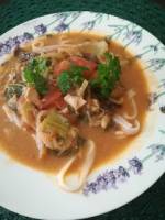 Tajska zupa z czerwonym carry i makaronem 164zupa jest pełna smaku z kawałkami delikatnego kurczaka,z makaronem ryżowym, kolendrą, i sokiem z limonki! Składniki 1 łyżka oliwy z oliwek 500-600 g