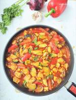 Leczo z kurczakiem i pieczarkami 128Leczo z kurczakiem i pieczarkami Dziś zapraszam na pyszne leczo z kurczakiem i pieczarkami . To troszkę inna wersja bardzo lubianego dania, równie smaczna i prosta w
