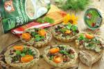 Dyniowe tartaletki z wędzonym łososiem, gruszką i nasturcją 219soczyście pomarańczowa, słodkawa z miękką skórką, której nie trzeba obierać. Pięknie się prezentuje w każdej postaci, w zupie, kluskach, ciastach… ale zupełnie wyjątkowo po upieczeniu, kiedy kumulują się w niej naturalne cukry. Bardzo łatwo ją aromatyzować dodatkami, ziołami, czosnkiem czy też grzybami, a po upieczeniu miękka skórka trzyma zwarty miąższ w ryzach. Tartaletki na dyniowym spodzie, nie wymagają(...)Sól,• Pieprz.Przegotowanie:1. Spód: Dynię przeciąć na pół, wydrążyć miąższ zostawiając brzeg gr. ok. 0,8 cm. Dyniowe miseczki skropić oliwą truflową, posypać świeżym tymiankiem, pieprzem i solą. Wstawić do nagrzanego piekarnika, piec 15 minut w 200 stopniach. 2. Nadzienie: Gruszkę pokroić w plastry, każdy posmarować papryczką przeciętą na pół, skropić sokiem z cytryny