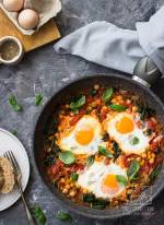 Szakszuka z ciecierzycą i szpinakiem 180Jajka możemy podawać na tysiąc sposobów, a jednym z najlepszych według mnie jest szakszuka. Nazywam go śniadaniowym comfort foodem - sycącym i poprawiającym nastrój, niczym odpowiednik jajek