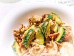 Makaron z cukinią, kurczakiem i suszonymi pomidorami 246Makaron z cukinią, kurczakiem i suszonymi pomidorami to bardzo szybki obiad. Do jego wykonania Madzia wykorzystała makaron razowy, który dodana mu wyjątkowego smaku. Makaron najlepiej smakuje