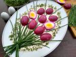 Jajka w sosie tatarskim 58Prosta przekąska ale za to w postaci pięknej kompozycji. Jajka zabarwiłam w wywarze z czerwonych buraków. Na sosie tatarskim ułożyłam kompozycje przypominającą bukiet kwiatów. Zabarwione jajka