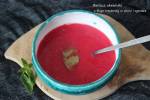 Zupa z burakami i czerwoną fasolą 222Taki trochę oszukany barszcz ukraiński. W smaku ta zupa naprawdę nieco go przypomina. Jeżeli jesteście posiadaczami zakwasu z buraków, zróbcie ją koniecznie. Składniki: 1 l bulionu warzywnego 500 ml zakwasu z buraków 3 buraki 3 ziemniaki 1 puszka czerwonej fasoli 2 ząbki czosnku 1 łyżka majeranku 1 łyżeczka octu jabłkowego sól pieprz mały kubek jogurtu naturalnego lub śmietany (przepis