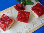 Truskawkowe ciasto z pianką jogurtową. 235dodać żółtka i miksować do połączenia. Mąki przesiać i porcjami dodawać do piany , delikatnie mieszać drewnianą łyżką do połączenia składników. Blachę o wymiarach 25x 35 cm wyłożyć papierem, wylać ciasto na nią i piec około 25 min lub do tzw. suchego patyczka w temp. 170C. Po upieczeniu odstawić do ostudzenia. Mus jogurtowy; 500 ml śmietany kremówki(...)około 10 min do napęcznienia. Po tym czasie postawić ja na palniku i podgrzewać do rozpuszczenia, jednak nie gotować. Zdjąć z palnika i dodać do ciepłego jogurtu. Dokładnie wymieszać. Masę przestudzić i wymieszać z pozostałym jogurtem. Śmietanę kremówkę przelać do miski, dodać cukier i ubijać na sztywną pianę. Do ubitej śmietany dodawać partiami jogurt i delikatnie mieszać do połączenia. Dodatkowo