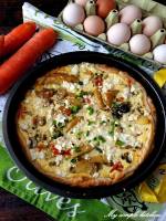 Tarta z warzywami i serem feta 259Piekarnik nagrzać do 180 stopni. Ciastem francuskim wyłożyć formę do tarty lub okrągłą blaszkę. Ponakłuwać widelcem i podpiec w piekarniku przez 10 minut. Mieszankę warzywną podsmażyć na patelni i przyprawić do smaku solą, pieprzem, vegetą i czosnkiem. Jajka wymieszać ze śmietaną i przyprawić odrobiną soli i pieprzu. Warzywa rozłożyć na podpieczonym spodzie i zalać masą jajeczną. Na wierzch pokruszyć
