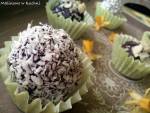 Bajaderki 184Ciasto pokruszyć/zmielić w maszynce do mielenia albo blenderze. Dodać bakalie, dżem/krem czekoladowy i 1 łyżkę alkoholu. W garnuszku podgrzewamy mleko z cukrem, kakao i masłem, stale mieszając roztapiamy na bardzo małym ogniu. Odstawiamy do wystygnięcia, a następnie dodajemy do pokruszonych ciastek. Wszystko razem dokładnie mieszamy (możemy pominąć ten krok, jeśli dodajemy nutellę). Gdy masa jest