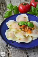 Fit pierożki z kalarepy z farszem paprykowym 230smakuje nawet w najprostszej wersji pokrojona w słupki, to absolutnie nic nie stoi na przeszkodzie, aby wypróbować poniższy przepis. Ba, wręcz trzeba go wypróbować. Warto zrezygnować z tradycyjnego mącznego ciasta na rzecz plasterków kalarepy – w ten sposób pierożki tracą kalorie zyskując jednocześnie na smaku. Poniższe danie może i wygląda na pracochłonne i skomplikowane, ale uwierz mi, w rzeczywistości jest proste(...)około 5 minut, od czasu do czasu mieszając. Następnie warzywa przełóż na deskę i jeszcze dokładnie przesiekaj nożem. Wrzuć do miski, dodaj zmielone nerkowce, oregano oraz sól i pieprz (masa powinna być mocno przyprawiona). Całość dokładnie wymieszaj. Teraz możesz zabrać się za formowanie pierożków – sięgnij po plaster kalarepy, na środku nałóż łyżeczkę farszu, przykryj kolejnym plastrem (plastry powinny być