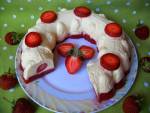 TORCIK BEZGLUTENOWY NA MĄCE RYŻOWEJ ZE ŚMIETANĄ I TRUSKAWKAMI 376dodatkiem sezonowych owoców. U mnie z truskawkami ale można przygotować go np.z malinami, jagodami itp. Biszkopt bezglutenowy na mące ryżowej bardzo podbił nasze serca, dzisiaj druga wersja tego super ciasta. Idealne do letniej kawki. Składniki: - biszkopt bezglutenowy przygotowany z tego przepisu - 250g mascarpone - 500ml śmietany kremówki 30% - 2 galaretki czerwone np.malinowe, truskawkowe... (u mnie bez cukru, dosładzam ksylitolem) - płatki czekoladowe(...)sztywno kremówkę razem z mascarpone. Następnie dodawać stopniowo zimną bliską tężenia galaretkę i dokładnie zamieszać. Otrzymamy różową, delikatną piankę. Na pierwszym blacie biszkoptowym (najlepiej nałożyć boki tortownicy by masa nam nie spływała) rozsmarować 2 łyżki konfitury, na nią wyłożyć ok.1/3 masy piankowej (gdy jest bardzo płynna odczekać, po chwili zacznie lekko gęstnieć) poukładać na niej połówki truskawek lub innych owoców