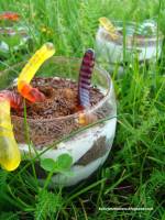 Dirt cake 230okazji zbliżającego się Dnia Dziecka chciałybyśmy zaproponować ciasto „Dirt cake” w nowej odsłonie. Pomysł został zaczerpnięty ztego przepisu jednak wprowadziłyśmy kilka drobnych modyfikacji. Deser jest pyszny, lekki, kremowy, ale najważniejszy w nim nie jest smak, a wygląd który zachwyca wszystkie dzieci :). Ilość porcji: 3 Składniki: Na ciemną warstwę: 250-300g ciemnych herbatników z kremem ½ banana 1/5 szklanki mleka(...)ciemny krem. W drugiej misce ubijamy kremówkę z cukrem pudrem i cukrem waniliowym. Pod koniec ubijania dodajemy serek mascarpone. Na dno małych miseczek lub szklanek wykładamy połowę ciemnej masy czekoladowej, na nią układamy połowę jasnej masy, następnie ciemna masa i jasna. Odstawiamy na chwilę do lodówki. Po wyjęciu posypujemy wierzch kakao, następnie obsypujemy posypką czekoladową. W każdą szklankę wciskamy żelkowe