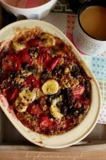 Pieczona poranna owsianka ♥♥♥ 202koktajl to na pierogi. A teraz? Kurka, truskawki są czy chcę czy nie :) Jemy, jemy a one dalej rosną! Trochę zamroziłam, część zjadamy na bieżąco, część upycham w ciastach, a na część szukam pomysłu na bieżąco. Takim sposobem trafiłam na TAKĄ . Pieczoną, z bananem, truskawkami i czekoladą. Boziu, jak to pachniało po upieczeniu! Ta owsianka była tylko dla mnie(...)mieszamy z pozostałymi suchymi składnikami. Przesypujemy całość do żaroodpornego naczynia, oddajemy połowę pokrojonych truskawek i lekko mieszamy. Roztrzepujemy jajko z roztopionym masłem, dodajemy mleko i ekstrakt waniliowy. Taką płynną masę wylewamy na suche składniki. Robimy łyżką dziury w kilku miejscach, aby masa dotarła głębiej, delikatnie mieszamy (nie musi być dokładnie, dosłownie kilka ruchów). Na wierzchu układamy pokrojonego w plastry banana