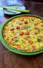 68. Przysmak na półkruchym spodzie: czyli wytrawna tarta z fasolką szparagową i dodatkami pod śmietanowo-jajeczną pierzynk 379czasu chłodzenia piekarnik nagrzewamy do 190*C (termoobieg). Schłodzone ciasto rozwałkowujemy na stolnicy posypanej mąką, rozwałkowujemy na grubość 1-1,5cm. Kolejno wykrajamy je od kształtu formy. Formę wyklejamy ciastem. Cały spód nakłuwamy widelcem robiąc dziurki na całej powierzchni lub pieczemy z obciążeniem - np. z nasionami grochu lub fasoli ( tak aby wyrosło równomiernie i nie było wybrzuszeń) i pieczemy(...)kolejno zapiekana). Ser feta kroimy w średnią kostkę. Piekarnik nastawiamy do 180*C (termoobieg). Na upieczony spód wykładamy fasolkę (w kształt słoneczka(:), fetę i pomidorki (na krzyż). Sporządzamy masę jajeczno-śmietanową. W misce łączymy ze sobą jaja, śmietanę oraz kremówkę. Umyte i osuszone listki kolendry drobno siekamy - tak samo postępujemy z ząbkami czosnku. Masę doprawiamy do smaku solą, pieprzem