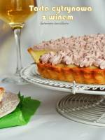 Tarta cytrynowa z winem 249Ciasto formujemy w kulę, owijamy folią spożywczą i wkładamy na 30 minut do lodówki. Zimne ciasto wałkujemy, przenosimy do blachy, dobrze dociskając brzegi. Spód nakłuwamy widelcem. Na wierzch ciasta układamy folię aluminiową lub papier do pieczenia, wysypujemy kulkami do pieczenia lub grochem/fasolą. Pieczemy 10 minut w temperaturze 180 stopni C. Po tym czasie zdejmujemy obciążenie i papier, pieczemy(...)cukier doprowadzamy do wrzenia. Dodajemy masło - mieszamy, do momentu rozpuszczenia tłuszczu. Jaja roztrzepujemy rózgą. Pod gotującym się sokiem zmniejszamy płomień do minimum, wlewamy jaja - ciągle mieszając. Gotujemy, aż masa zgęstnieje ( stanie się jak budyń ). Do namoczonej żelatyny dolewamy odrobinę wrzątku - rozpuszczamy. Rozpuszczoną żelatynę dodajemy do masy cytrynowej - dokładnie mieszamy. Krem studzimy, wcześniej przykrywając go folią spożywczą. W ten sposób