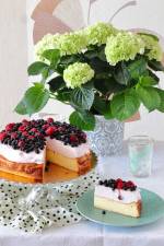 Sernik z kremem i owocami 201Sernik z kremem i owocami, to połączenie klasycznego pieczonego sernika z dodatkiem w postaci kremu na bazie śmietany z galaretką, udekorowanego świeżymi lub mrożonymi owocami. U