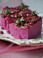 Deser z kaszy jaglanej z granatami 370Dzisiaj sobota, polecam więc wam zaskakujący smakiem i kolorem deser. Deser ten wygląda jak sernik na zimno, chociaż nie ma z nim nic wspólnego, gdyż w