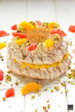 Bezowa korona z kremem pomarańczowym i pistacjami // wieniec bezowy 192M iałem cudowny sen... śniło mi się bezowe królestwo, w którym w bezowym pałacu na bezowym tronie zasiadał bezowy król w bezowej koronie. Koronę miał obłędną