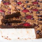 BROWNIE Z BORÓWKAMI I MALINOWYM COULIS 211Podzielne i sycące brownie z borówkami i malinowym coulis. Mokre, słodkie i rozpływające się w ustach. Z czekoladową posypką na wierzchu. Idealne do zabrania na