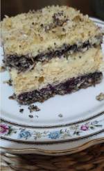 Makowa panienka 377cytryn 150 gram masła Biszkopt makowy: Białka ubijamy na sztywną pianę, dodajemy szczyptę soli. Następnie stopniowo dodajemy cukier. Gdy cukier się nam rozpuści dodajemy 4 żółtka. Pozostałe składniki ( wiórki kokosowe, migdały i mak) mieszamy do połączenia się składników szpatułką. Biszkopt pieczemy około 40 minut w temperaturze 180 ° . Po ostudzeniu kroimy go na dwie równe części. Masa: Nastawiamy 300 ml mleka(...)skórką z cytryny dodając stopniowo po łyżce budyniu aż do wykorzystana całego. Miksujemy aż do uzyskania jednolitej masy. Do udekorowania ciasta możemy uprażyć na patelni wiórki kokosowe z cukrem wanilinowym :) Ciasto składamy: biszkopt 2/3 masy biszkopt 1/3 masy uprażone wiórki kokosowe SMACZNEGO