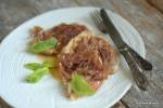 Polędwica wieprzowa a`la saltimbocca 188Saltimbocca to stare, tradycyjne włoskie danie, o którym, pod koniec XIX wieku, tak pisał Pellegrino Artusi „Saltimbocca to zraziki z mlecznej cielęciny, lekko doprawione solą, pieprzem