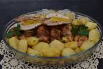 Udka pieczone z ziemniakami 145Nie masz czasu na przygotowanie obiadu, szukasz szybkiego w przygotowaniu przepisu, mam coś dla Ciebie. Faszerowane udka kurczaka brzoskwiniami, a to wszystko zapiekane z ziemniakami. Danie