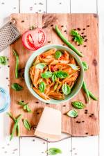 Makaron z papryką i fasolką szparową w sosie pomidorowym 162Makaron z papryką i fasolką szparową w sosie pomidorowym to niewątpliwie pomysł na obiad, który przypadnie do gustu niemal każdemu! Niesamowicie prosty i szybki w przygotowaniu