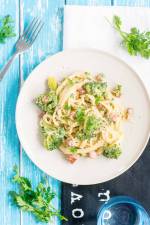 Spaghetti carbonara z brokułem i mozzarellą 131Spaghetti carbonara z brokułem i mozzarellą to moja wariacja na temat klasyki. Mam nadzieję, że rodowici Włosi nie zadrżeliby nazbyt nad tą profanacją klasycznej carbonary, jednak