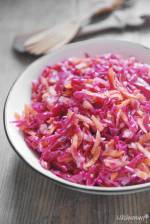 Surówka z kiszonej czerwonej kapusty z marchewką 168Od jakiegoś czasu sama kiszę czerwoną kapustę. Czemu akurat tę? A bez konkretnego powodu, jakoś tak. Parę lat temu udało mi się dostać taką w sklepie