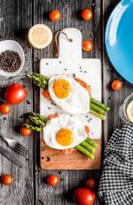 Bruschetta z grillowanymi szparagami, pomidorkami i jakiem sadzonym 188Doskonała domowa bruschetta zapieczona z oliwą i natarta czosnkiem, podana z grillowanymi szparagami, pomidorkami koktajlowymi i idealnym jajkiem sadzonym z wciąż płynnym żółtkiem. Doskonała sezonowa przekąska