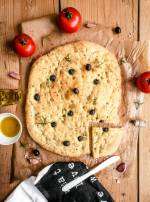 Focaccia z oliwkami, ziołami i czosnkiem 144Focaccia z oliwkami, ziołami i czosnkiem – doskonały rodzaj pieczywa wywodzący się z kuchni włoskiej, który przypadnie do gustu każdemu. Świetnie smakuje sam, zamoczony w oliwie
