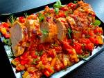 Polędwiczka pieczona w sosie włoskim 347Polędwiczka pieczona w sosie włoskim Kruche i soczysto mięso pieczone w boczku oraz duszone w pysznym i bardzo aromatycznym sosie. Danie zarówno prezentuje się, jak i