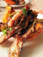 Biały boczek pieczony z dynią hokkaido i jabłkiem 159danie dla dwóch osób 300 g boczku białego w plastrach sól pieprz papryka suszona 4-5 plasterków pora oliwa 2 ząbki czosnku pół dyni hokkaido