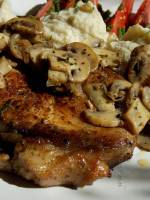 Karkówka z pieczarkami i puree z kalafiora 1603 plastry karkówki 3 łyżki oliwy 1 łyżka octu balsamicznego świeży rozmaryn pieprz ziołowy pieprz czarny 1 łyżka miodu sól 200 g pieczarek 1 cebula 1