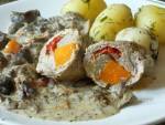 Rolady w grzybach leśnych 1836 plastrów ładnej szynki marchewka kawałek papryki cebula sól pieprz pieprz ziołowy staropolski mąka majeranek lubczyk 300 g grzybów leśnych mrożonych Mięso rozbić na cienkie plastry