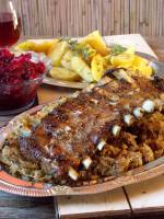 Żeberka pieczone na kapuście, ziemniaki z pieca i surówka z pieczonego buraka 1971 kg żeberek w jednym pasku 1 kg kapusty kiszonej garść suszonych jabłek pół słoiczka suszonych pomidorów w oliwie 1 cebula kminek sól pieprz pieprz ziołowy