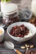 Czekoladowa granola 98Coś na dobry początek dnia :). Miseczka domowej granoli w towarzystwie mleka lub jogurtu - nie ma nic lepszego na start! A jeszcze granola CZEKOLADOWA?? Udany dzień gwarantowany