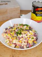 Sałatka meksykańska 367Sałatka meksykańska to kolorowa i prosta przekąska. Bardzo fajnie smakuje, a dodatkowo nie wymaga dużego nakładu pracy. Składa się z kilku prostych składników, które wystarczy ze