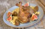 Smaki Francji współczesna kuchnia francuskaKaczka kocha owoce z wzajemnością. Chyba wszyscy lubimy kaczkę z jabłkami, proponuję kaczkę z figami (całą kaczkę należy podzielić na ćwiartki), nogi z kaczki z figami . 4 nogi kaczki, 8 świeżych fig, sok z jednej pomarańczy, 1 łyżeczka cynamonu, kilka gałązek tymianku, 4 łyżki miodu, 100 – 150 ml dobrego bulionu, sól, Nogi kaczki położyć na zimnej patelni(...)skórą do dołu i smażyć na małym ogniu, aż się skóra zrumieni. Naczynie do zapiekania wysmarować tłuszczem wytopionym podczas smażenia nóg kaczki. Ułożyć nogi, oprószyć solą. Wokół ułożyć figi pokrojone w ćwiartki i gałązki tymianku. Miód wymieszać z cynamonem, bulionem i sokiem z pomarańczy. Polać mieszaniną kaczkę. Wstawić do piekarnika nagrzanego do 160 stopni i piec około