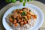 Gulasz z karkówką, batatami i jarmużem / Pork, sweet potato and kale stew 262karkówki pokrojonej w 2 cm kostkę 2 średnie bataty, obrane i pokrojone w kostkę ¼ szklanki czerwonej soczewicy, opłukanej pod bieżącą wodą 2 pomidory, pokrojone w kostkę 1 czerwona papryka, pokrojona w kostkę 1/2 średniej cukinii, pokrojonej w kostkę 1 szklanka posiekanego jarmużu 1 1/2 szklanki bulionu warzywnego i drobiowego 1 łyżka masła orzechowego 1 cebula, pokrojona w drobną kostkę