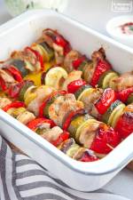 Szaszłyki z kurczaka i warzyw, które robi się w piekarniku. PRZEPIS 200Idealne na obiad w większym gronie, kilka dużych szaszłyków piecze się jednocześnie, więc na stół od razu można podać całą brytfankę. To zawsze robi na wszystkich