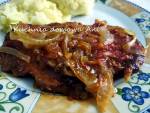 Karkówka po rumuńsku , pyszny obiad 215czasem wyluzujmy … Polecam , szybkie , łatwe , tanie , smaczne . Składniki dla 4 osób : 4 grube plastry , niezbyt tłustej karkówki ( około 2 cm ) 4 łyżki ketchupu 4 łyżki pasty z pieczonej papryki ( upiec czerwoną paprykę w piekarniku z oliwą i zmiksować ) 1 duża cebula 1 łyżeczka wędzonej , słodkiej papryki 1 łyżeczka ostrej papryki 2 łyżeczki granulowanego czosnku 1 łyżeczka brązowego cukru(...)karkówkę , smarujemy majonezem . Układamy na nim plastry karkówki . Każdy doprawiamy sola , papryką wędzoną , granulowanym czosnkiem , kminkiem i ostrą papryką . Dodatkowo na każdą porcję karkówki nakładamy i rozprowadzamy łyżkę pasty paprykowej . Na patelni podsmażamy pokrojoną cienko cebulę z brązowym cukrem i octem , do momentu , aż się przyrumieni .Układamy ją na karkówce , następnie polewamy ketchupem , po łyżce na plaster , oraz po łyżce