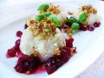 Knedle serowe z sosem żurawinowym i orzechami 192łyżkiSOS:- świeża żurawina – 150g- wanilia – 1 laska- cukier – 40 g- sok żurawinowy ” Paola ” – 75 ml- mąka kukurydziana – 1 łyżkaSPOSÓB PRZYRZĄDZENIA:KNEDLE:Ser rozcieramy drewnianą łyżką.Dodajemy masło , roztrzepane 2 jajka , kaszę manną , sól i trochę mąki.Dokładnie razem mieszamy.Oprószonymi mąką dłońmi formujemy knedelki.Wrzucamy na gotującą , lekko osoloną wodę i gotujemy