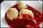 serowe knedle z truskawkami - razowe i bez jajek! 218Pamiętam moje pierwsze knedle...Robiłam je w poprzednie wakacje. Były to knedle ziemniaczane, a że nie mam praski, żeby je przez nią przecisnąć, musiałam 'zgnieść' je praską ręczną...No, nie wyszło mi to do końca idealnie i w knedlach zdarzało się często natrafić na grudkę z ziemniaka. Zraziłam się do tych klusek i przez(...)jednego knedla. z reszty zróbcie sos (przepis poniżej) W szerokim garnku zagotować wodę i lekko ją osolić. Ser wymieszać z mąką i cukrem. Truskawki pokroić na połówki. Z masy serowej nabierać po kawałku masy (najlepiej lekko wilgotnymi / lub obsypanymi mąką rękami), spłaszczyć go, położyć truskawkę i zalepić, a następnie nadać kształt kulki. Postępować tak do wykończenia masy. Knedle wrzucać