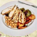 Pierś kurczaka pieczona z ciecierzycą 106Pierś kurczaka pieczona z warzywami pokrojonymi na kawałki podana z ciecierzycą w sosie z tymiankiem i cytryną. PIERŚ KURCZAKA PIECZONA SKŁADNIKI pierś kurczaka o wadze około