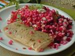 Pstrąg łososiowy z pęczakiem, buraczkami i wędzonym twarogiem 445Pstrąg łososiowy przygotowany w foli aluminiowej na patelni jest podobny do ryby gotowanej na parze. Smaczny i aromatyczny dzięki temu, że dusi się w sosie własnym. Podałam go z kaszą pęczak, różową od pieczonego buraczka ćwikłowego i z wyraźnym smakiem wędzonki dzięki twarogowi. Taką sałatkę z buraczkiem można podać na ciepło jak również na zimno. Polecam na lekki, zdrowy obiad(...)podczas duszenia. Odstawić na około godzinę. Na patelni wlać trochę wody, a kiedy zawrze, położyć zawinięte filety. Dusić z jednej strony około 5 minut, a potem przewrócić za pomocą łopatki na drugą stronę. Czas duszenia zależy od grubości ryby. Podlewać wrzątkiem, gdyby woda zdążyła odparować zanim pstrąg będzie gotowy. Buraczka ugotować lub upiec w piekarniku zawijając w folię aluminiową. Kaszę