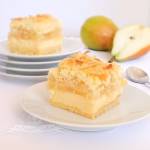 Ciasto z gruszkami i masą jogurtową 842miską. Teraz czas na warstwę gruszkową. Obrane i oczyszczone z gniazd nasiennych owoce, pociąć w niewielkie kawałki. Przełożyć do garnka. Dodać sok z cytryny i postawić na gaz. Gotować, aż będą mięciutkie ale nie rozpadające się (fot.1) . Zdjąć z ognia. Odlać około 1/3 szklanki soku, który wydzielił się podczas prażenia i rozpuścić w nim mąkę (dokładnie, żeby nie było grudek(...)ponownie zmiksować, ale tylko do połączenia składników. Na koniec w osobnym naczyniu, ubić na sztywno kremówkę. Po ubiciu dodać ją delikatnie do masy za pomocą łyżki lub łopatki (fot.3) . Masę jogurtową wylać na wcześniej podpieczony spód. Wyrównać wierzch i piec w temp. 180°C, przez 20-25 minut, aż góra masy się zetnie. Po wyjęciu
