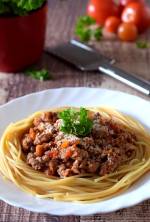 Spaghetti z sosem mięsno-pomidorowym (bolognese) 169Makaron po bolońsku jest jednym z moich ulubionych dań. Jest smaczny i bardzo sycący. Kiedyś kupowaliśmy gotowy sos w słoiczku, ale przecież taki sos jest bardzo
