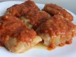 Gołąbki z sosem pomidorowym 277danie, chociaż nieco pracochłonne. Farsz do gołąbków składa się u mnie z niezbyt tłustej mielonej łopatki wieprzowej i ryżu, zaś sos oczywiście jest pomidorowy. Chociaż raz na kwartał w moim domu obowiązkowo muszą być na obiad gołąbki. Gołąbki zazwyczaj przygotowuję w szybkowarze, co przyśpiesza gotowanie i zapobiega rozprzestrzenianiu się po kuchni zapachu gotowanej kapusty. Czas gotowania w garnku lub szybkowarze(...)robię, to brakuje mi ich smaku, więc idę na skróty i przygotowuję chociaż: Zapiekankę gołąbkową . Składniki: (na około 24 szt. gołąbków) 1 średnia główka białej kapusty 1 kg mielonej łopatki wieprzowej 200 g ryżu (u mnie basmati kupiony TUTAJ ) 3 ząbki czosnku 1 łyżka majeranku 1 łyżeczka kminku 1 łyżeczka pieprzu ziołowego 1/2 łyżeczki pieprzu naturalnego 1 łyżka czosnku niedźwiedziego